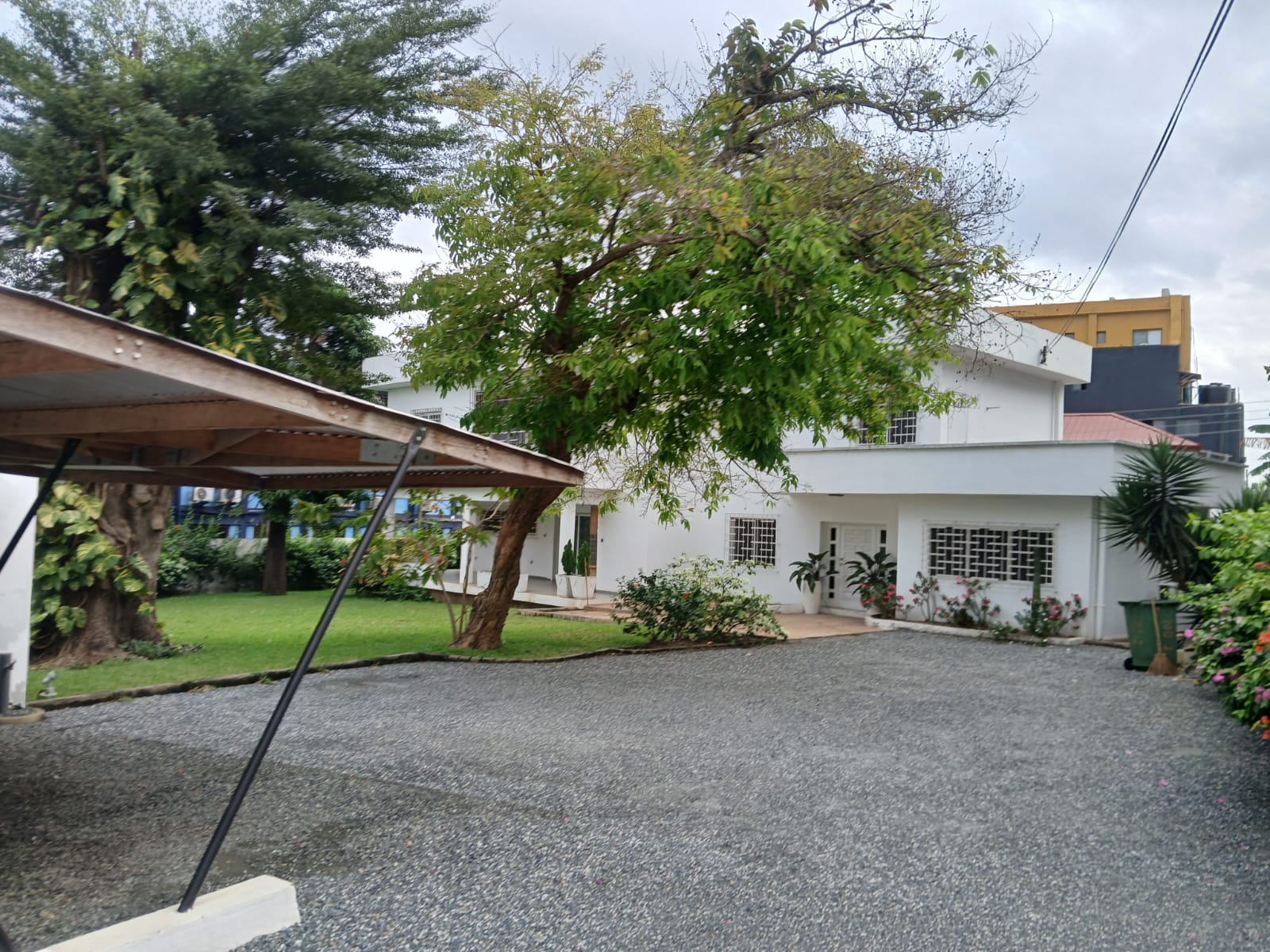 Enjoy a breathtaking rooftop entertainment area, perfect for private gatherings and evening relaxation. The large green compound includes a covered parking canopy for two cars, a driveway, and modern security features including CCTV surveillance, electric fencing, and a 24kVA genset for uninterrupted power supply.
